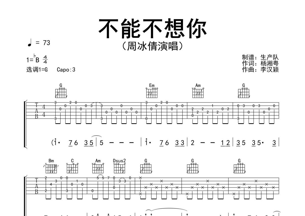 《不能不想你》是周冰倩演唱的一首歌曲,精编完美版,拍号为4/4拍,歌曲速度为每分钟73拍,歌曲原调为Bb调,但由于原调指法比较难,为了方便弹奏,本吉他谱采用的是G调指法编配,变调夹3品弹奏即为原调,当然也可以根据自己的音域改变变调夹位置,或者通过改变和弦调性,以方便自己弹奏,这份吉他谱共有三张高清图谱,图谱由 @生产队 编配上传,图谱使用六线谱编配,包含吉他和弦指法、简谱以及歌词部分,使用这份不能不想你吉他谱,可以让你更加方便地掌握这首歌曲的弹唱技巧,快来尝试吧。周冰倩演唱的歌曲《不能不想你》原版吉他谱,含前奏、间奏、尾奏solo编配,精编完美版,怀旧经典!。