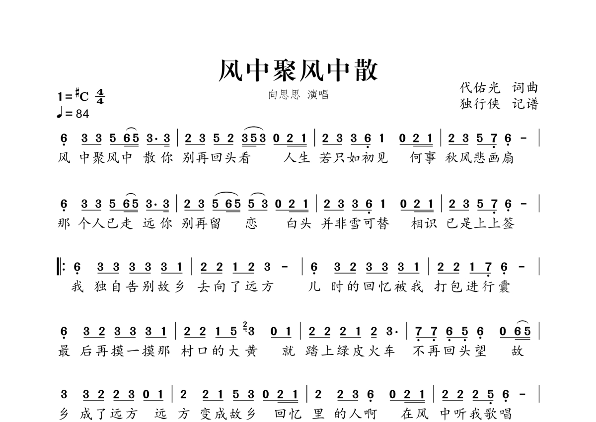 风中聚风中散简谱 - 向思思演唱