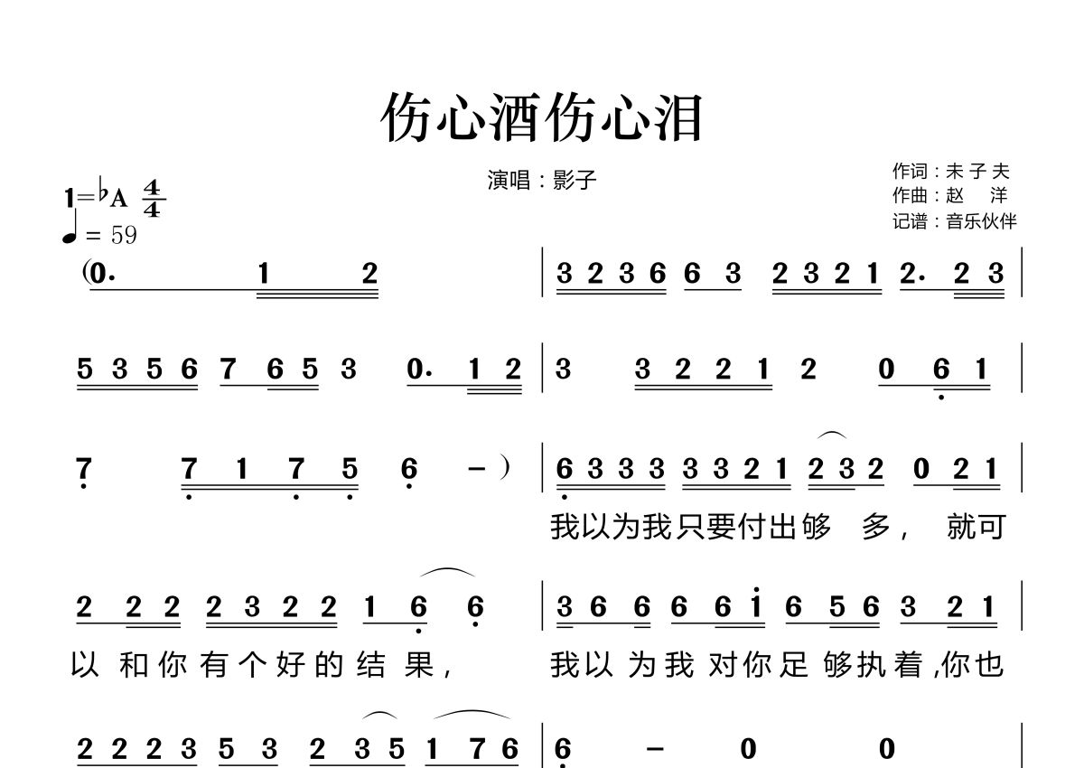 《伤心酒伤心泪》是影子演唱的一首歌曲,拍号为4/4拍,歌曲速度为每分钟59拍,这份简谱共有两张高清图谱,图谱由 @音乐伙伴 编配上传。