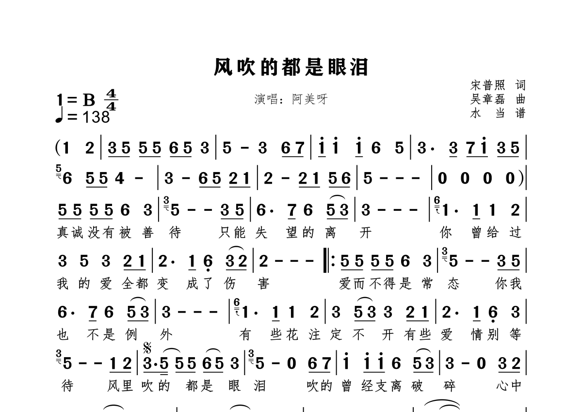 《风吹的都是眼泪》是阿美呀演唱的一首歌曲,歌曲速度为每分钟138拍,这份简谱共有一张高清图谱,图谱由 @水当 编配上传原调B。