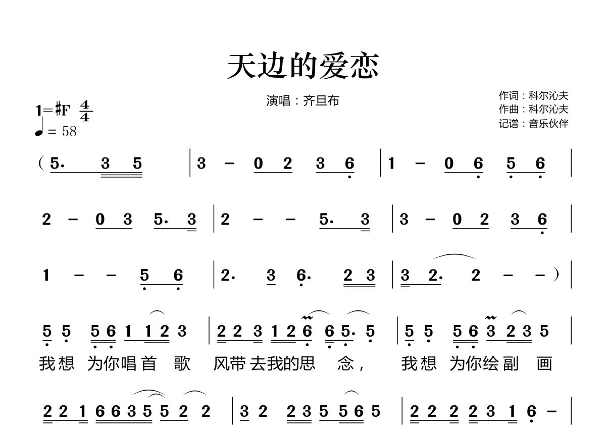 《天边的爱恋》是齐旦布演唱的一首歌曲,拍号为4/4拍,歌曲速度为每分钟58拍,这份简谱共有两张高清图谱,图谱由 @音乐伙伴 编配上传。