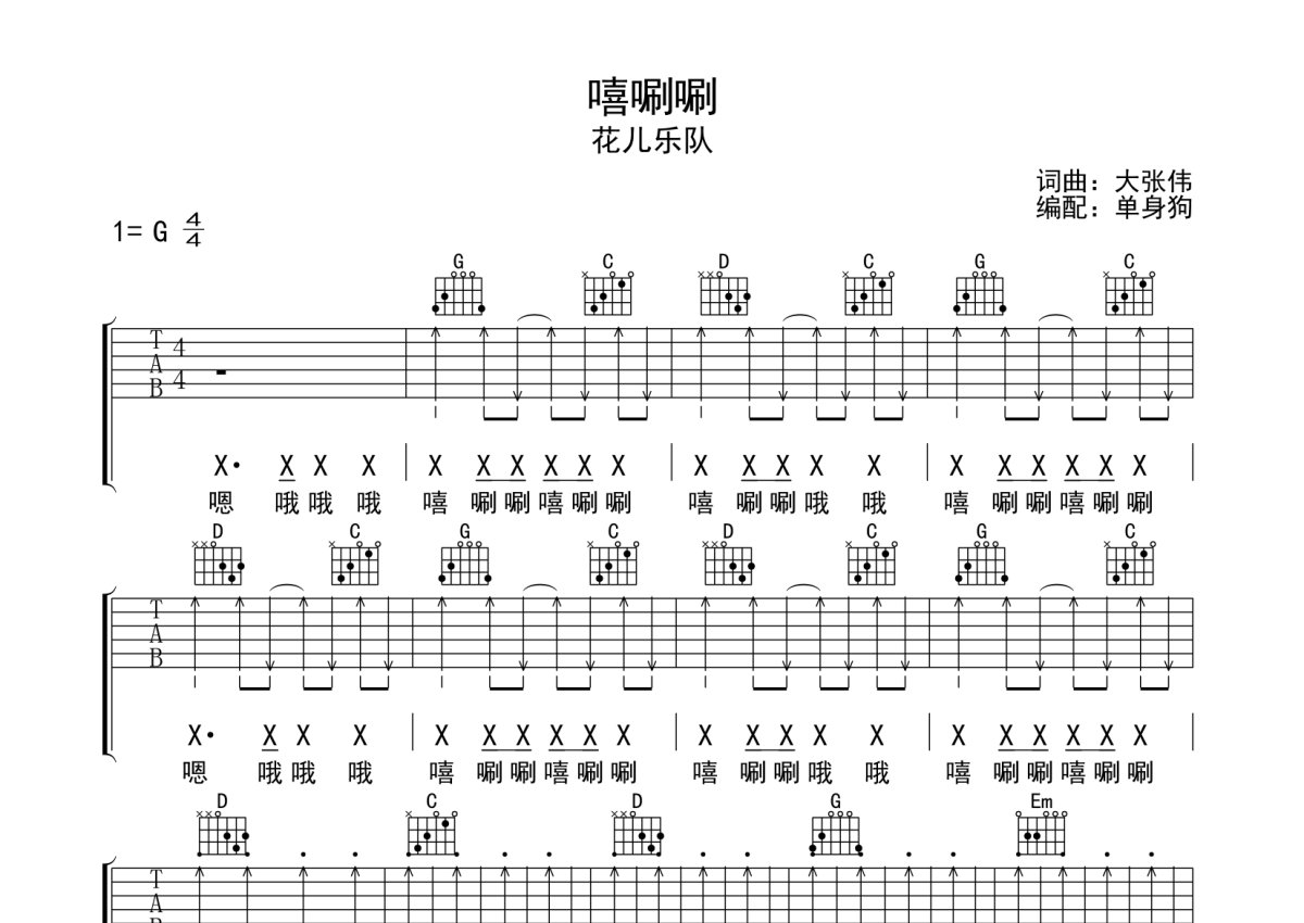 花儿乐队《嘻唰唰》吉他谱 - G调弹唱六线谱