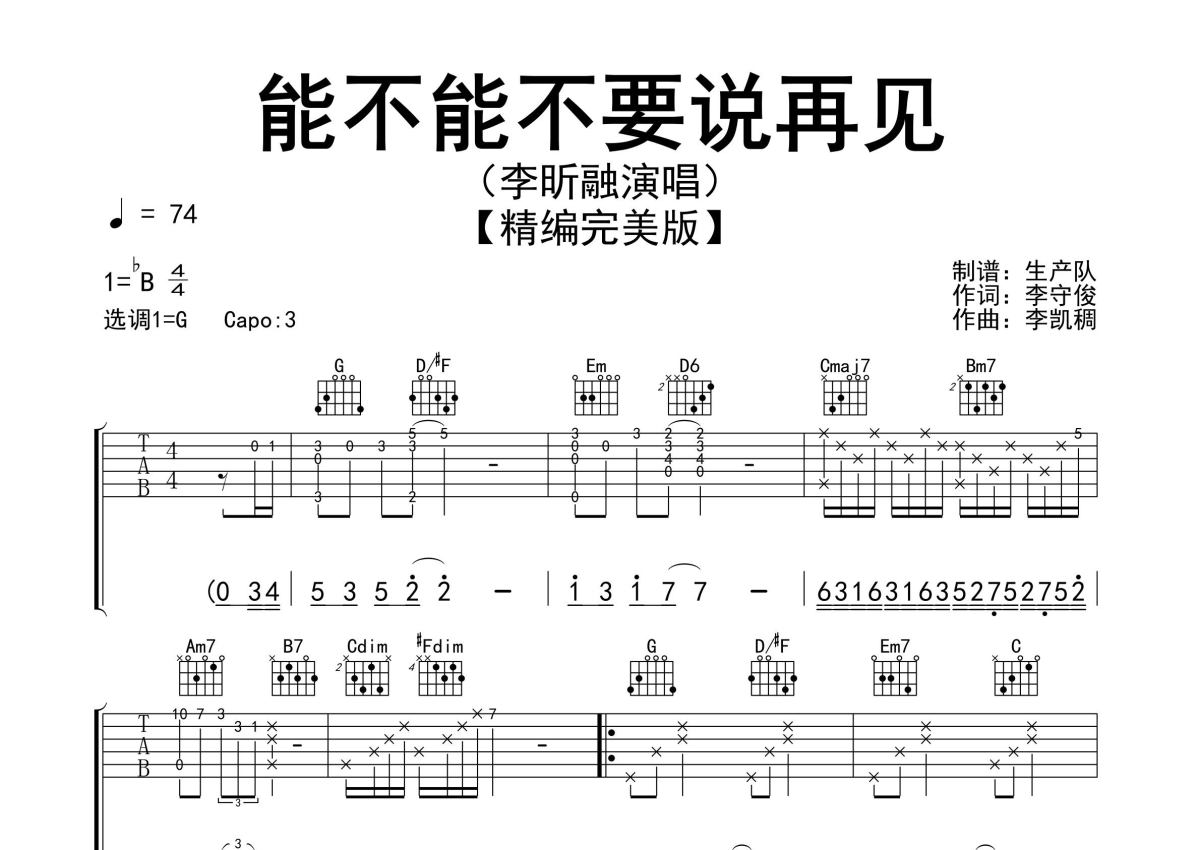 《能不能不要说再见》是李昕融演唱的一首歌曲,精编完美版,拍号为4/4拍,歌曲速度为每分钟74拍,歌曲原调为Bb调,但由于原调指法比较难,为了方便弹奏,本吉他谱采用的是G调指法编配,变调夹3品弹奏即为原调,当然也可以根据自己的音域改变变调夹位置,或者通过改变和弦调性,以方便自己弹奏,这份吉他谱共有三张高清图谱,图谱由 @生产队 编配上传,图谱使用六线谱编配,包含吉他和弦指法、简谱以及歌词部分,使用这份能不能不要说再见吉他谱,可以让你更加方便地掌握这首歌曲的弹唱技巧,快来尝试吧。李昕融演唱的歌曲《能不能不要说再见》原版吉他谱,含前奏、间奏solo编配,精编完美版,值得推荐!。