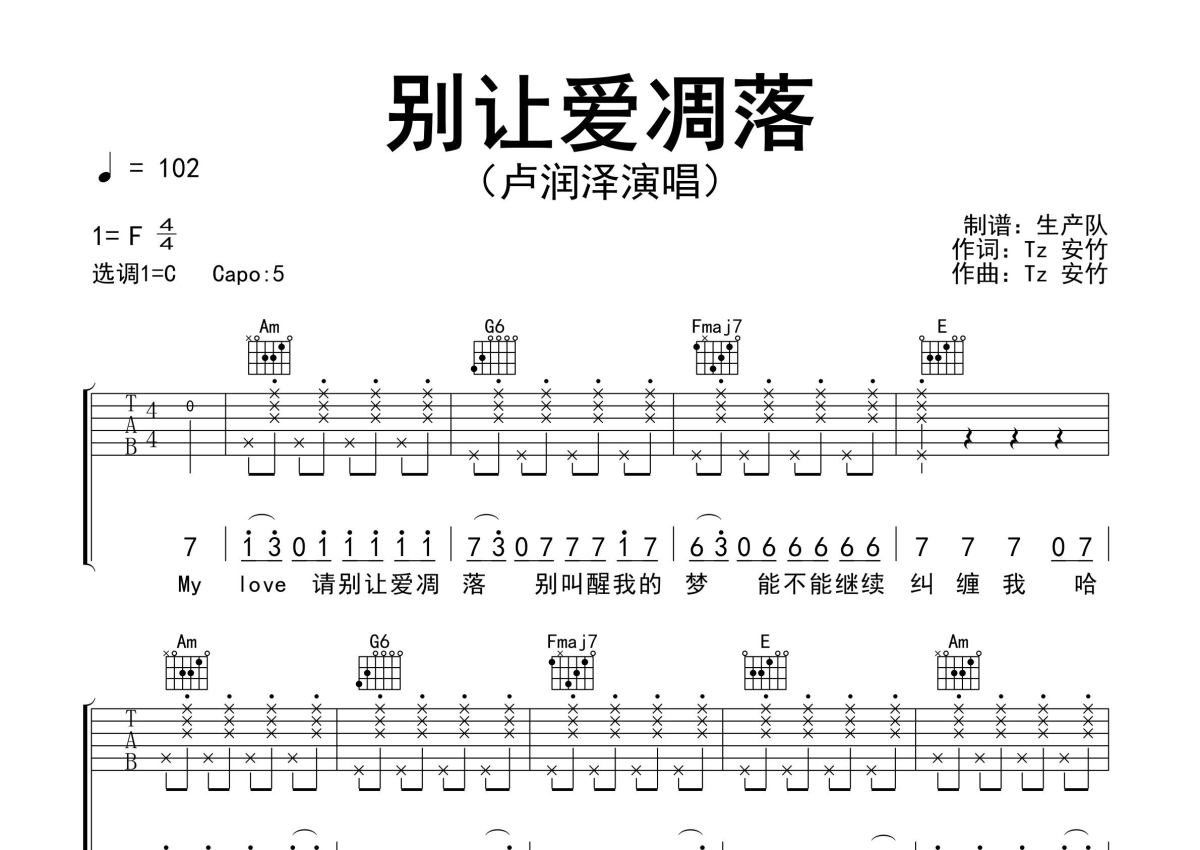 《别让爱凋落》是卢润泽演唱的一首歌曲,精编完美版,拍号为4/4拍,歌曲速度为每分钟102拍,歌曲原调为F调,但由于原调指法比较难,为了方便弹奏,本吉他谱采用的是C调指法编配,变调夹5品弹奏即为原调,当然也可以根据自己的音域改变变调夹位置,或者通过改变和弦调性,以方便自己弹奏,这份吉他谱共有三张高清图谱,图谱由 @生产队 编配上传,图谱使用六线谱编配,包含吉他和弦指法、简谱以及歌词部分,使用这份别让爱凋落吉他谱,可以让你更加方便地掌握这首歌曲的弹唱技巧,快来尝试吧。卢润泽演唱的歌曲《别让爱凋落》原版吉他谱,精编完美版,值得推荐!。