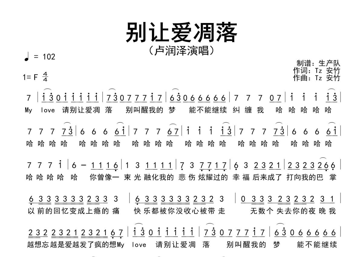 《别让爱凋落》是卢润泽演唱的一首歌曲,原版简谱,拍号为4/4拍,歌曲速度为每分钟102拍,这份简谱共有一张高清图谱,图谱由 @生产队 编配上传卢润泽演唱的歌曲《别让爱凋落》原版简谱,精编完美版,值得推荐!。