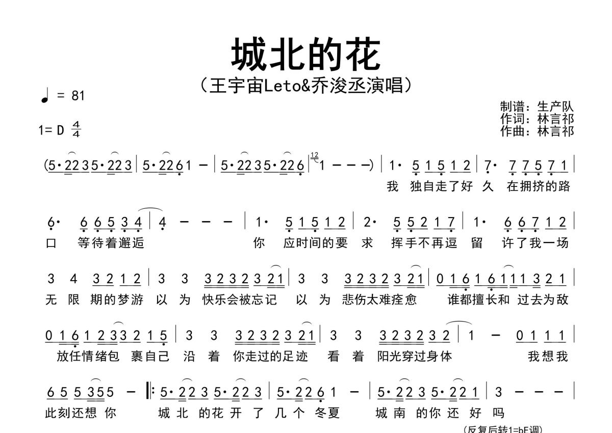 《城北的花》是王宇宙Leto&乔浚丞演唱的一首歌曲,原版简谱,拍号为4/4拍,歌曲速度为每分钟81拍,这份简谱共有一张高清图谱,图谱由 @生产队 编配上传王宇宙Leto&乔浚丞演唱的歌曲《城北的花》原版简谱,精编完美版,值得推荐!。