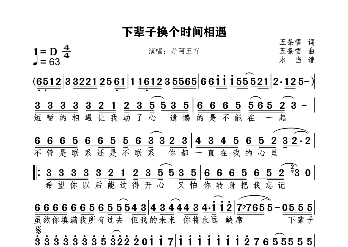 《下辈子换个时间相遇》是是阿五吖演唱的一首歌曲,拍号为4/4拍,歌曲速度为每分钟63拍,这份简谱共有一张高清图谱,图谱由 @水当 编配上传原调D。