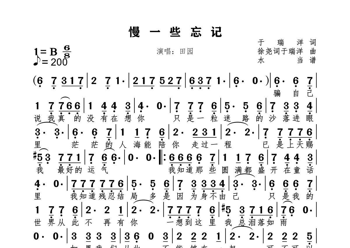 《慢一些忘记》是田园演唱的一首歌曲,拍号为6/8拍,歌曲速度为每分钟200拍,这份简谱共有一张高清图谱,图谱由 @水当 编配上传原调B。