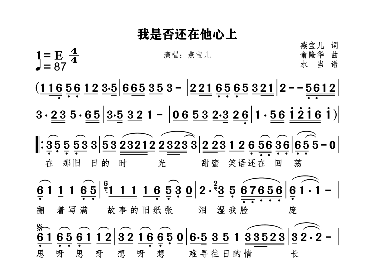 《我是否还在他心上》是燕宝儿演唱的一首歌曲,拍号为4/4拍,歌曲速度为每分钟87拍,这份简谱共有一张高清图谱,图谱由 @水当 编配上传原调E。