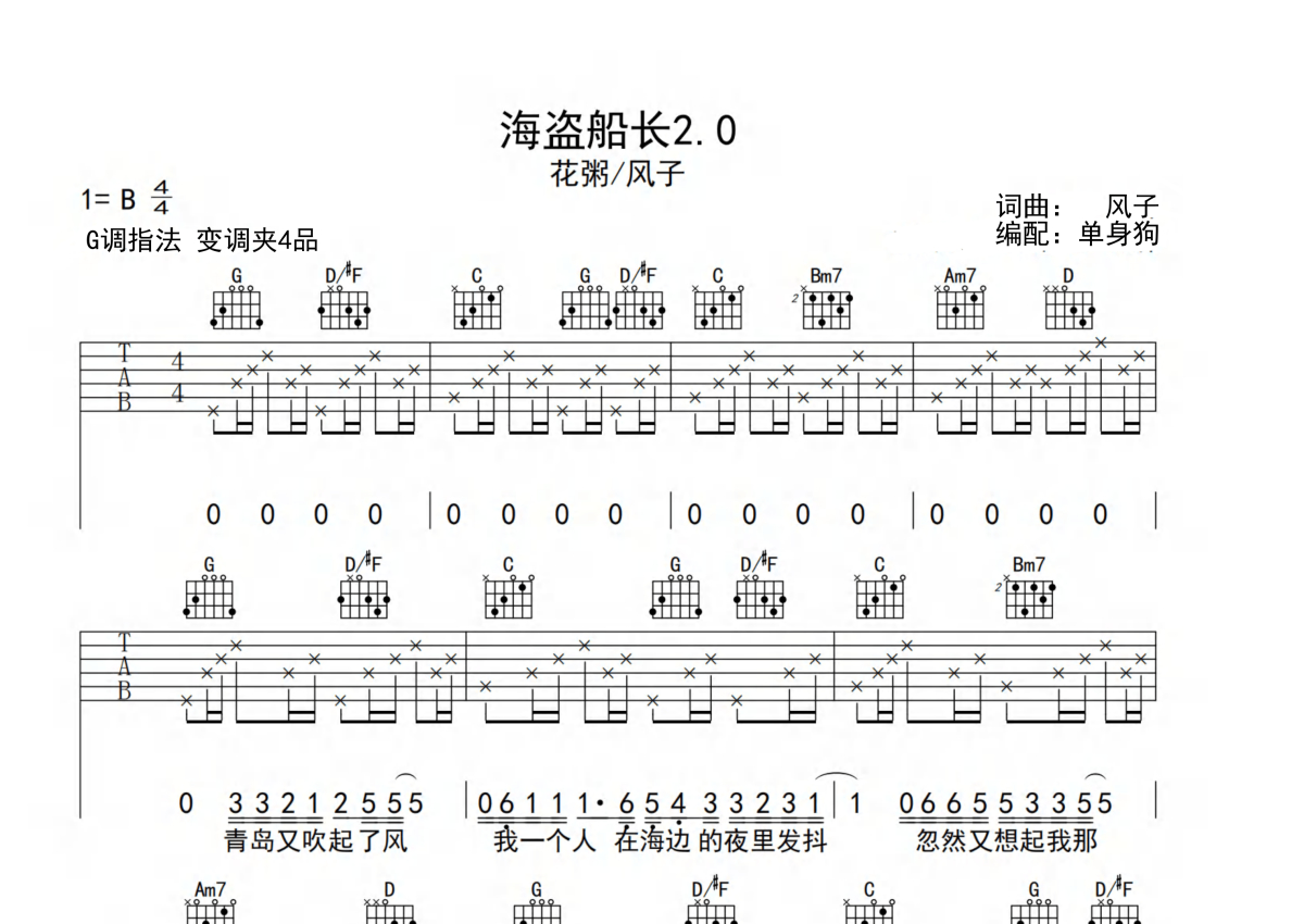花粥&风子《海盗船长2.0》吉他谱 - G调弹唱六线谱
