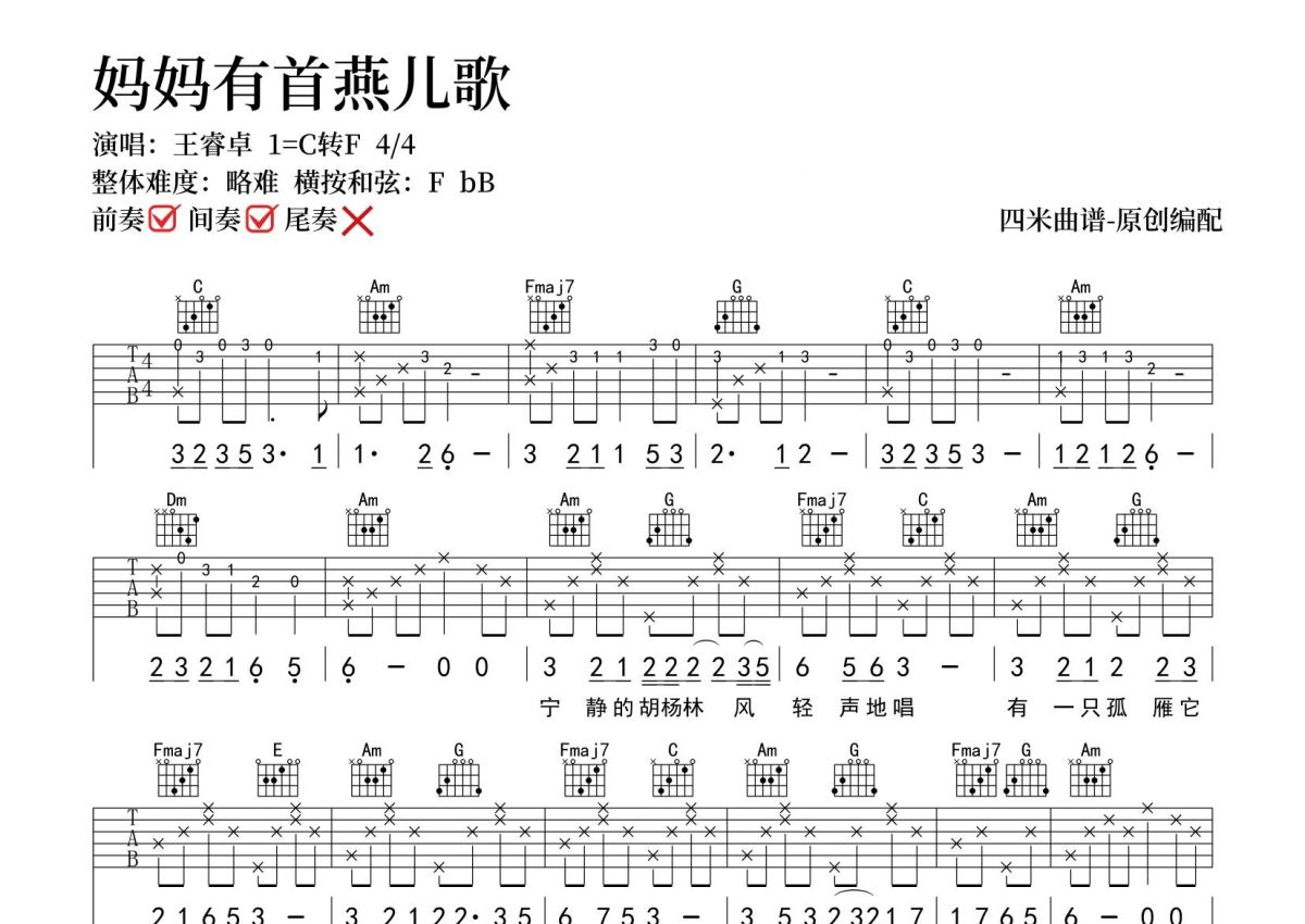 王睿卓《妈妈有首燕儿歌》吉他谱 - C调弹唱六线谱