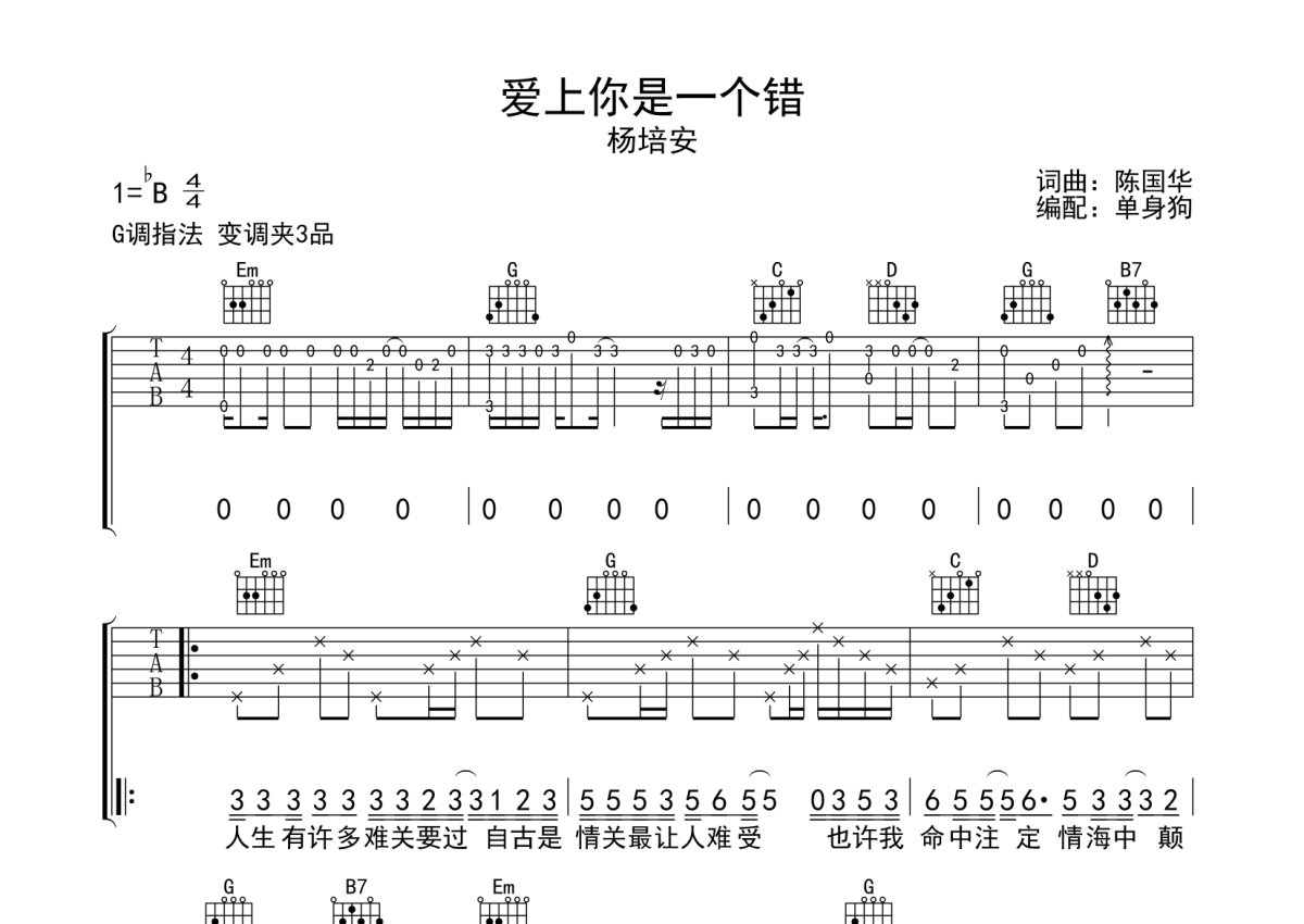 杨培安《爱上你是一个错》吉他谱 - G调弹唱六线谱