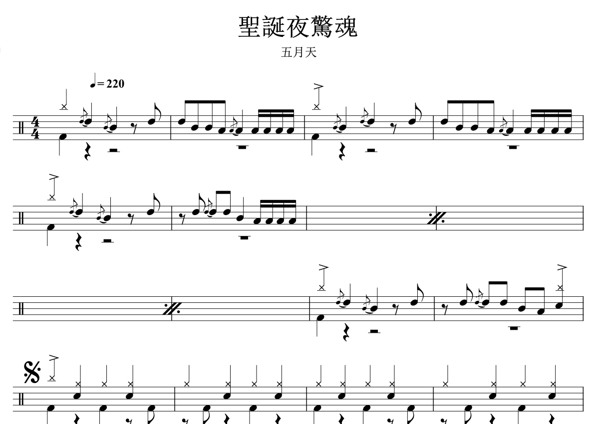 《圣诞夜惊魂》是五月天演唱的一首歌曲,拍号为4/4拍,歌曲速度为每分钟220拍,这份架子鼓谱共有四张高清图谱,图谱由 @音符喷血者 编配上传,图谱使用五线谱编配,使用这份圣诞夜惊魂架子鼓谱,你将能够轻松地敲打出这首五月天的圣诞夜惊魂,快来尝试吧。