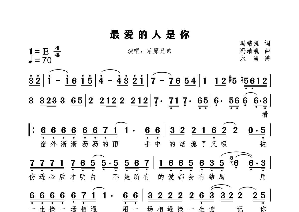 《最爱的人是你》是草原兄弟演唱的一首歌曲,拍号为4/4拍,歌曲速度为每分钟70拍,这份简谱共有一张高清图谱,图谱由 @水当 编配上传原调E。