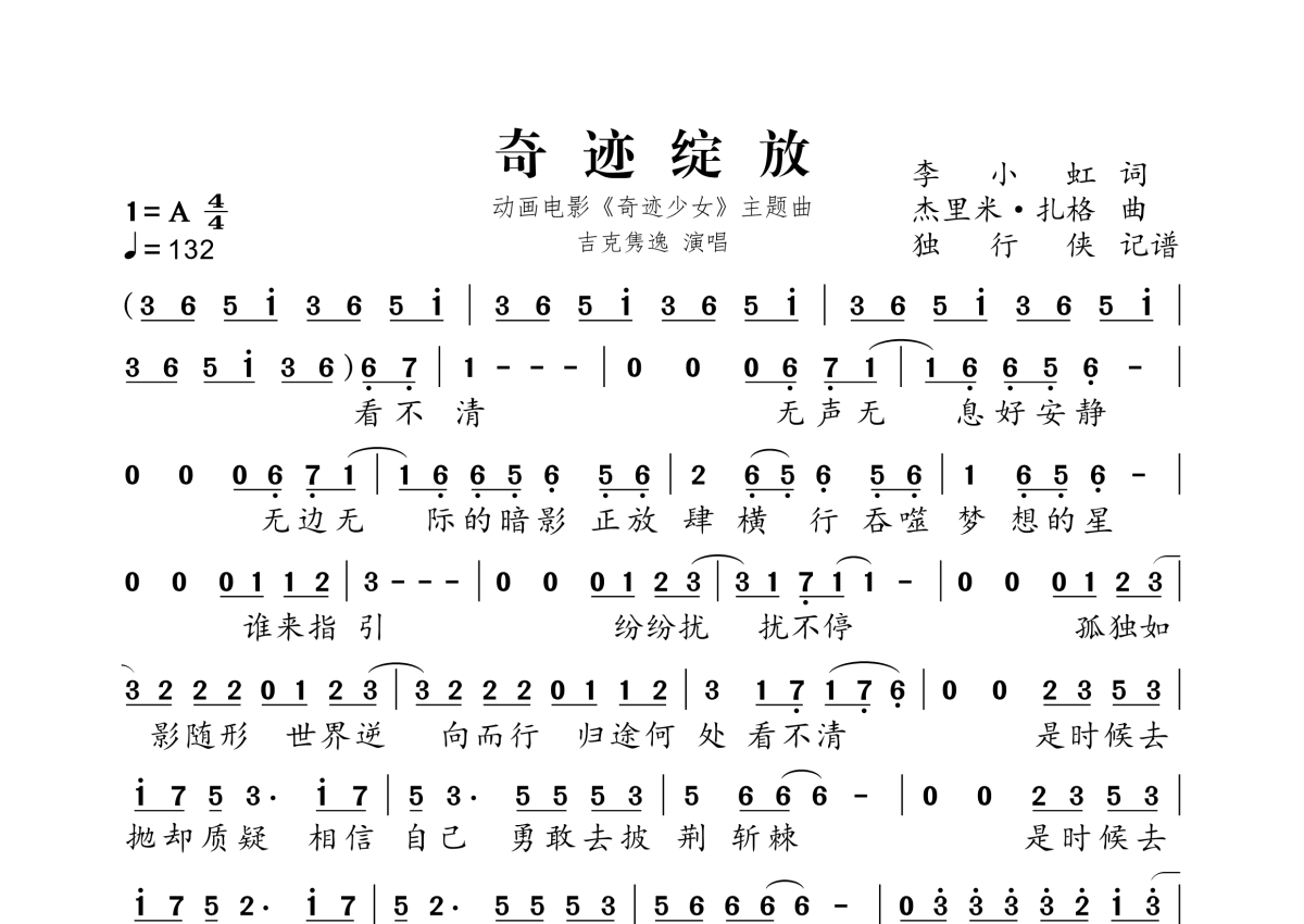 《奇迹绽放 《奇迹少女》动画电影主题曲》是吉克隽逸演唱的一首歌曲,这份简谱共有两张高清图谱,图谱由 @独行侠 编配上传。
