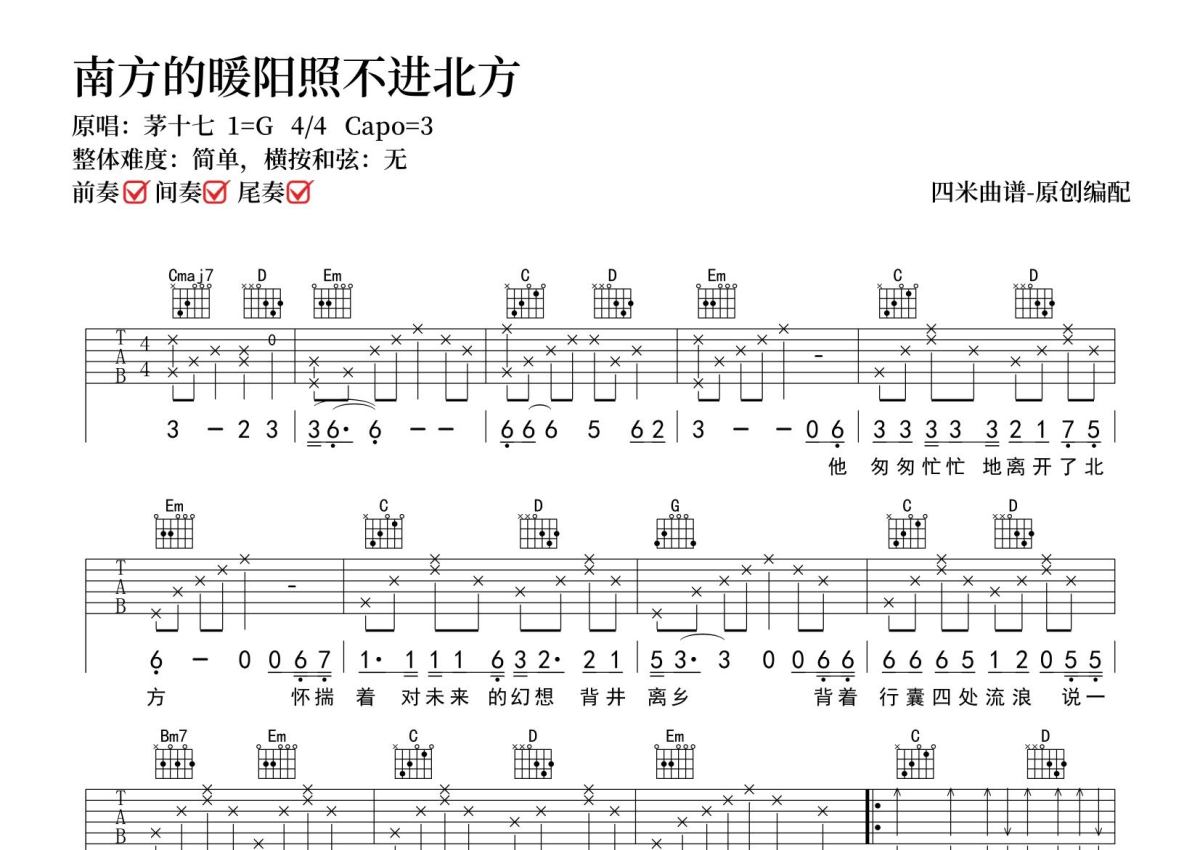 茅十七《南方的暖阳照不进北方》吉他谱 - G调弹唱六线谱