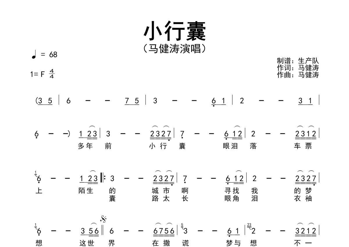 《小行囊》是马健涛演唱的一首歌曲,原版简谱,拍号为4/4拍,歌曲速度为每分钟68拍,这份简谱共有一张高清图谱,图谱由 @生产队 编配上传马健涛作词、作曲并演唱的歌曲《小行囊》原版简谱,含前奏、间奏、尾奏solo编配,精编完美版,值得推荐!。