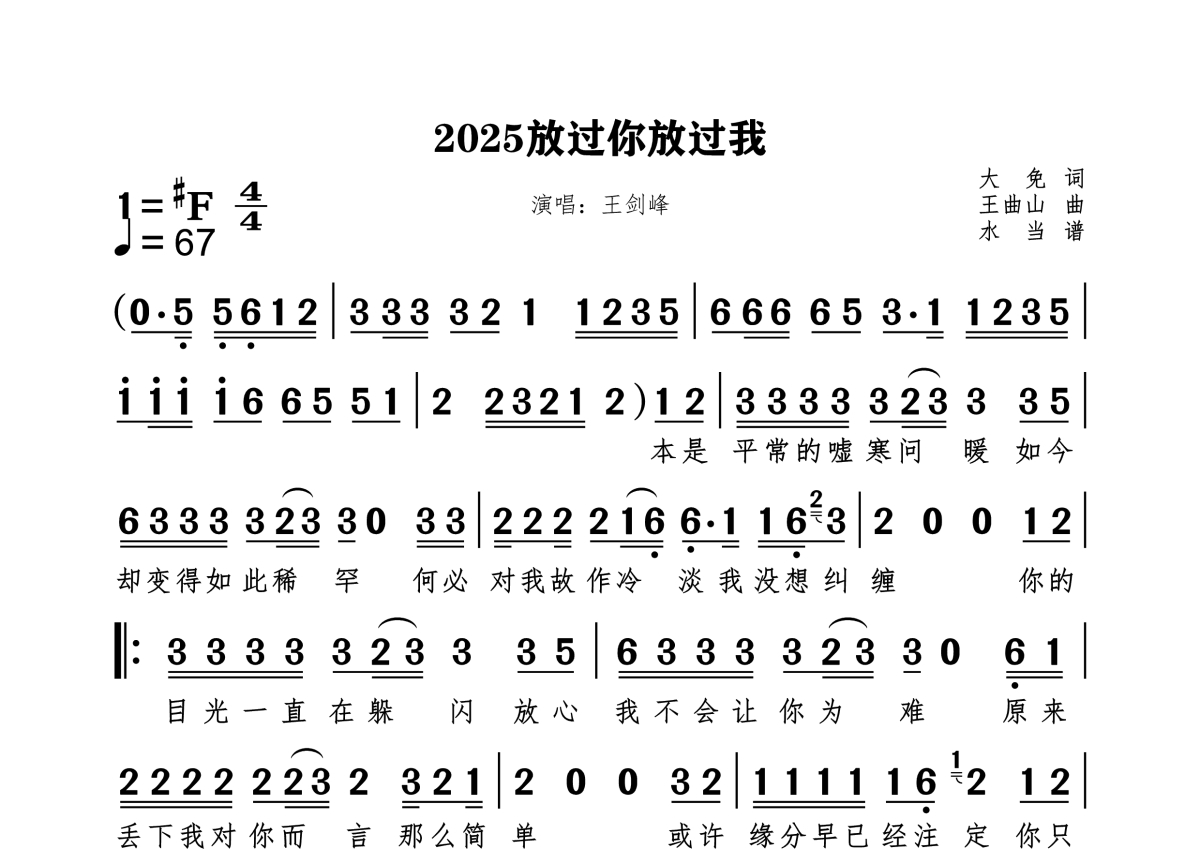 《2025放过你放过我》是王剑锋演唱的一首歌曲,拍号为4/4拍,这份简谱共有一张高清图谱,图谱由 @水当 编配上传。