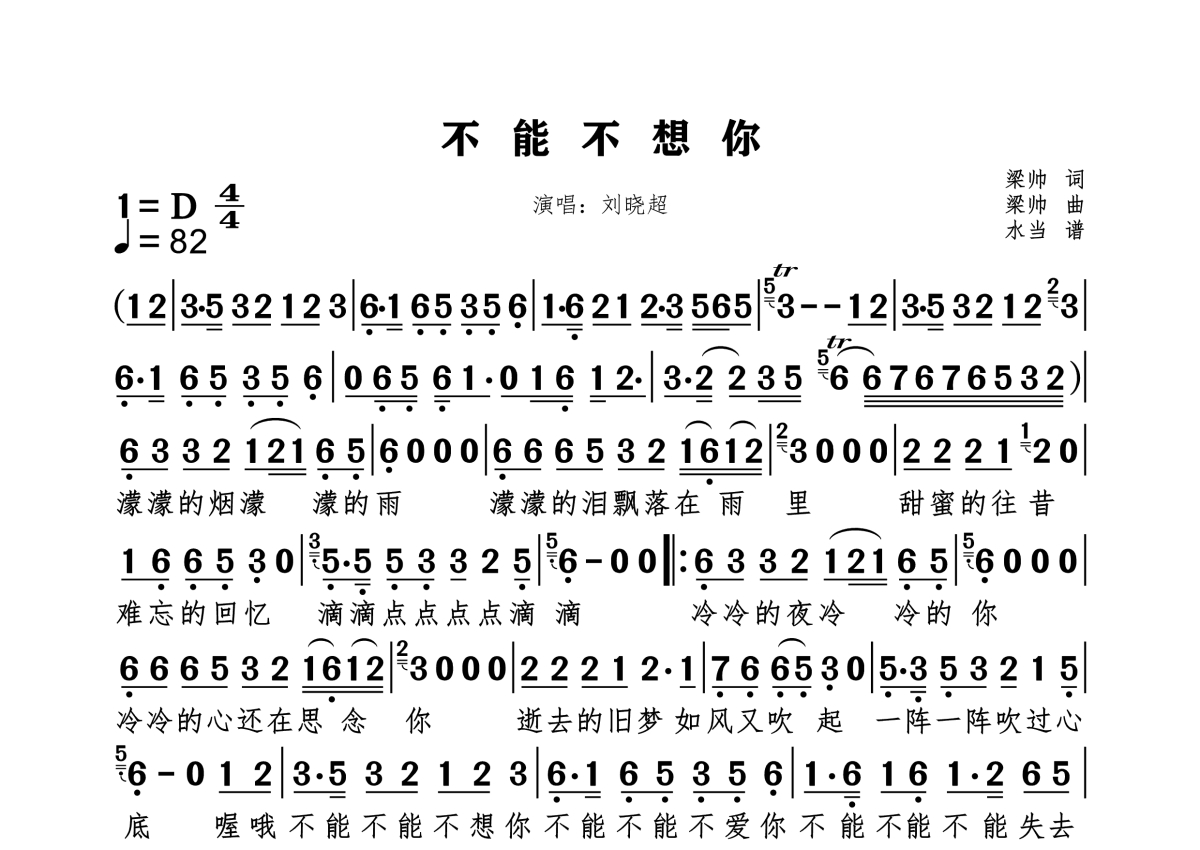 《不能不想你》是刘晓超演唱的一首歌曲,拍号为4/4拍,歌曲速度为每分钟82拍,这份简谱共有一张高清图谱,图谱由 @水当 编配上传。