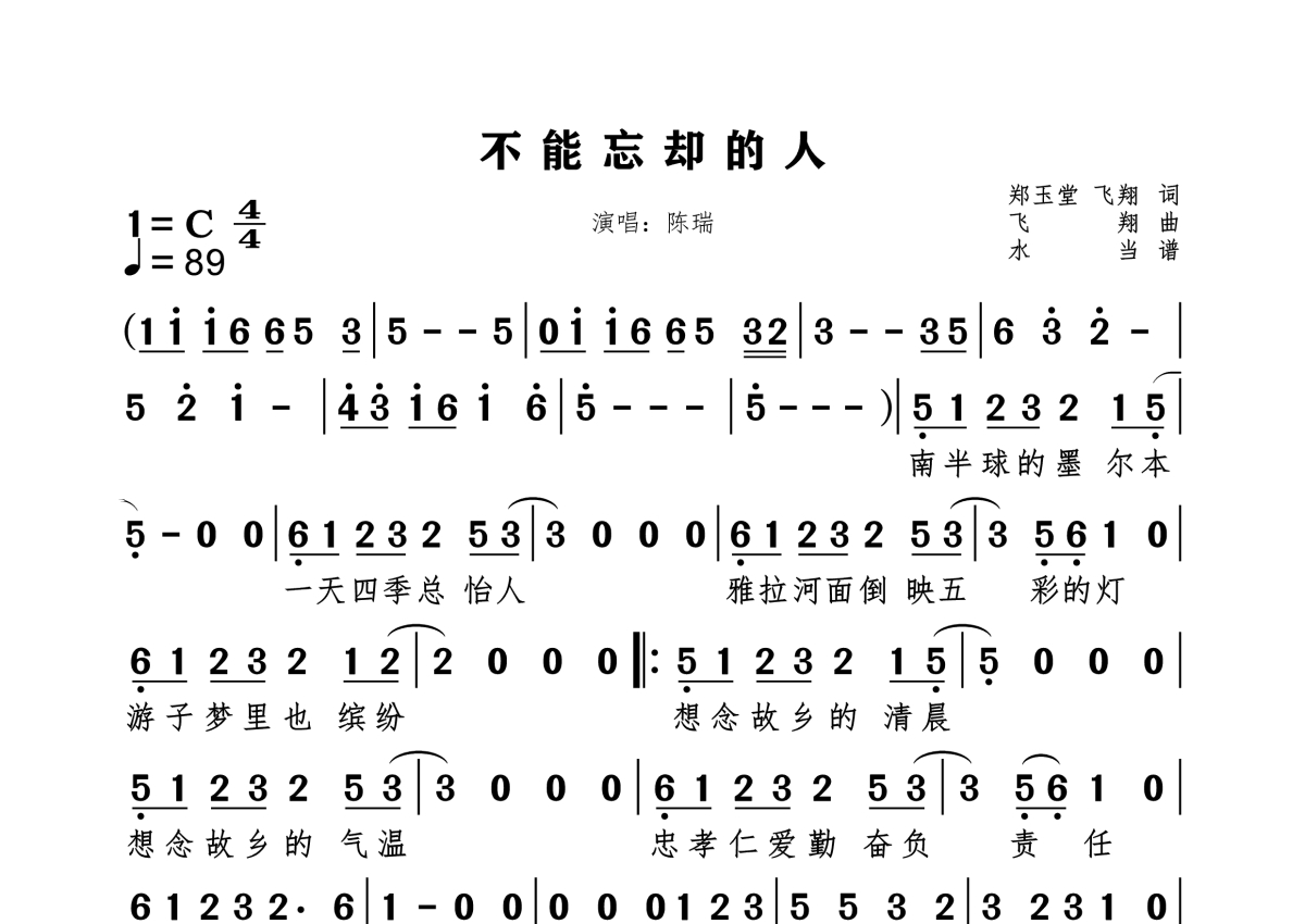 《不能忘却的人》是陈瑞演唱的一首歌曲,拍号为4/4拍,歌曲速度为每分钟89拍,这份简谱共有一张高清图谱,图谱由 @水当 编配上传。