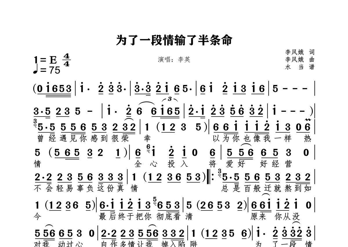 《为了一段情输了半条命》是李英演唱的一首歌曲,拍号为4/4拍,这份简谱共有一张高清图谱,图谱由 @水当 编配上传。