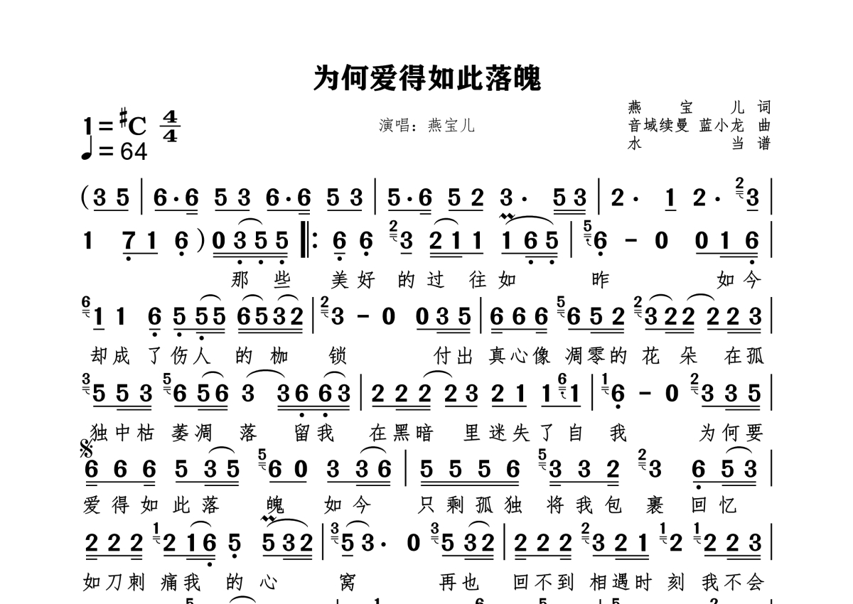 《为何爱得如此落魄》是燕宝儿演唱的一首歌曲,拍号为4/4拍,这份简谱共有一张高清图谱,图谱由 @水当 编配上传。