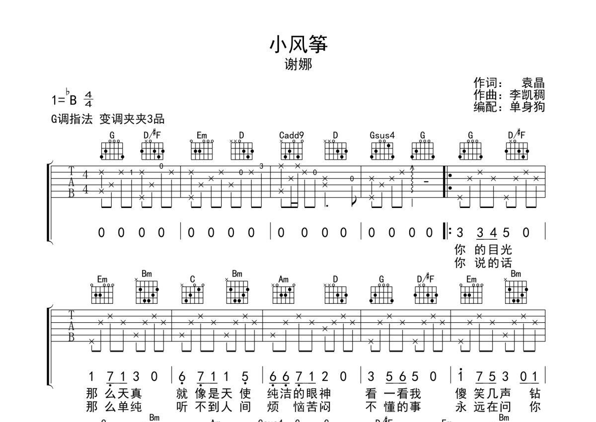 《小风筝》是谢娜演唱的一首歌曲,本吉他谱采用的是G调指法编配,这份吉他谱共有两张高清图谱,图谱由 @单身狗 编配上传,图谱使用六线谱编配,包含吉他和弦指法、简谱以及歌词部分,使用这份小风筝吉他谱,可以让你更加方便地掌握这首歌曲的弹唱技巧,快来尝试吧。谢娜《小风筝》吉他弹唱谱,采用G调指法编配,单身狗编配出品,共有2张高清图谱,免翻页排版设计。