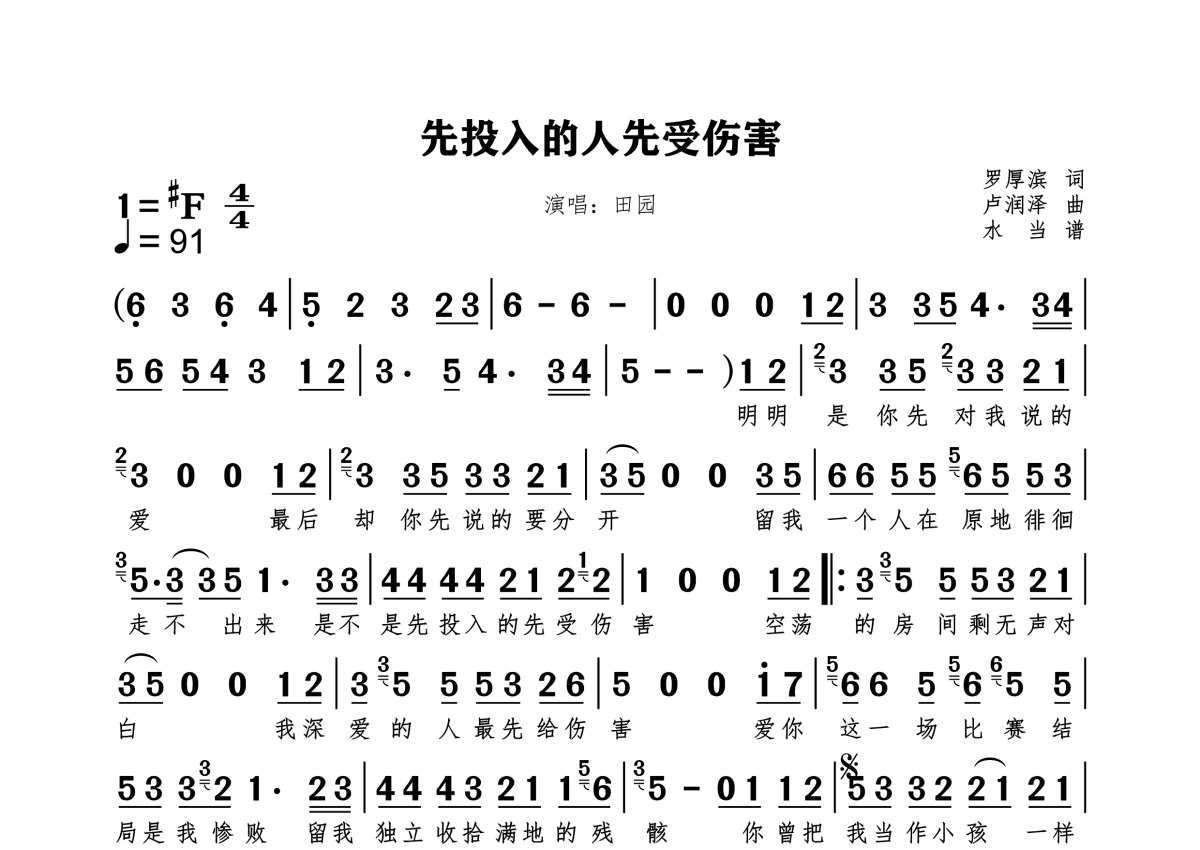 《先投入的人先受伤害》是田园演唱的一首歌曲,拍号为4/4拍,这份简谱共有一张高清图谱,图谱由 @水当 编配上传。