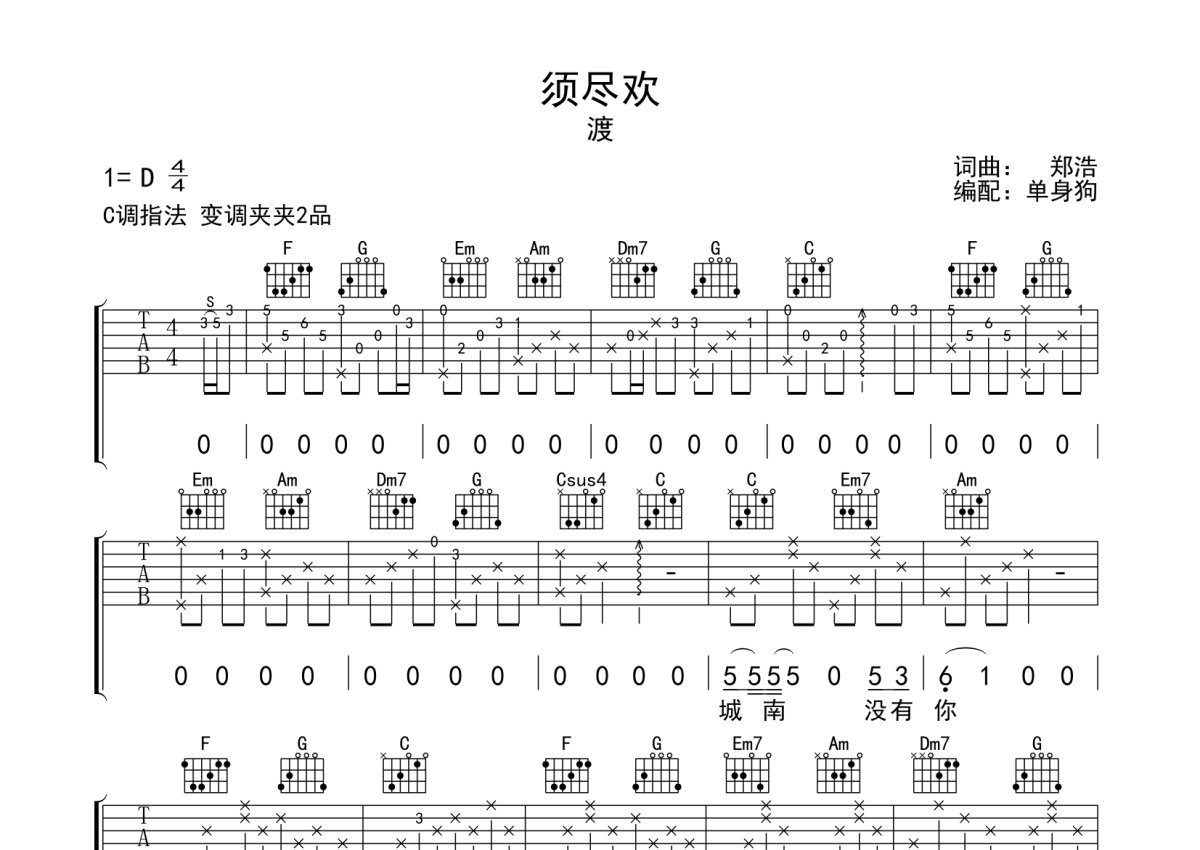 渡《须尽欢》吉他谱 - C调弹唱六线谱