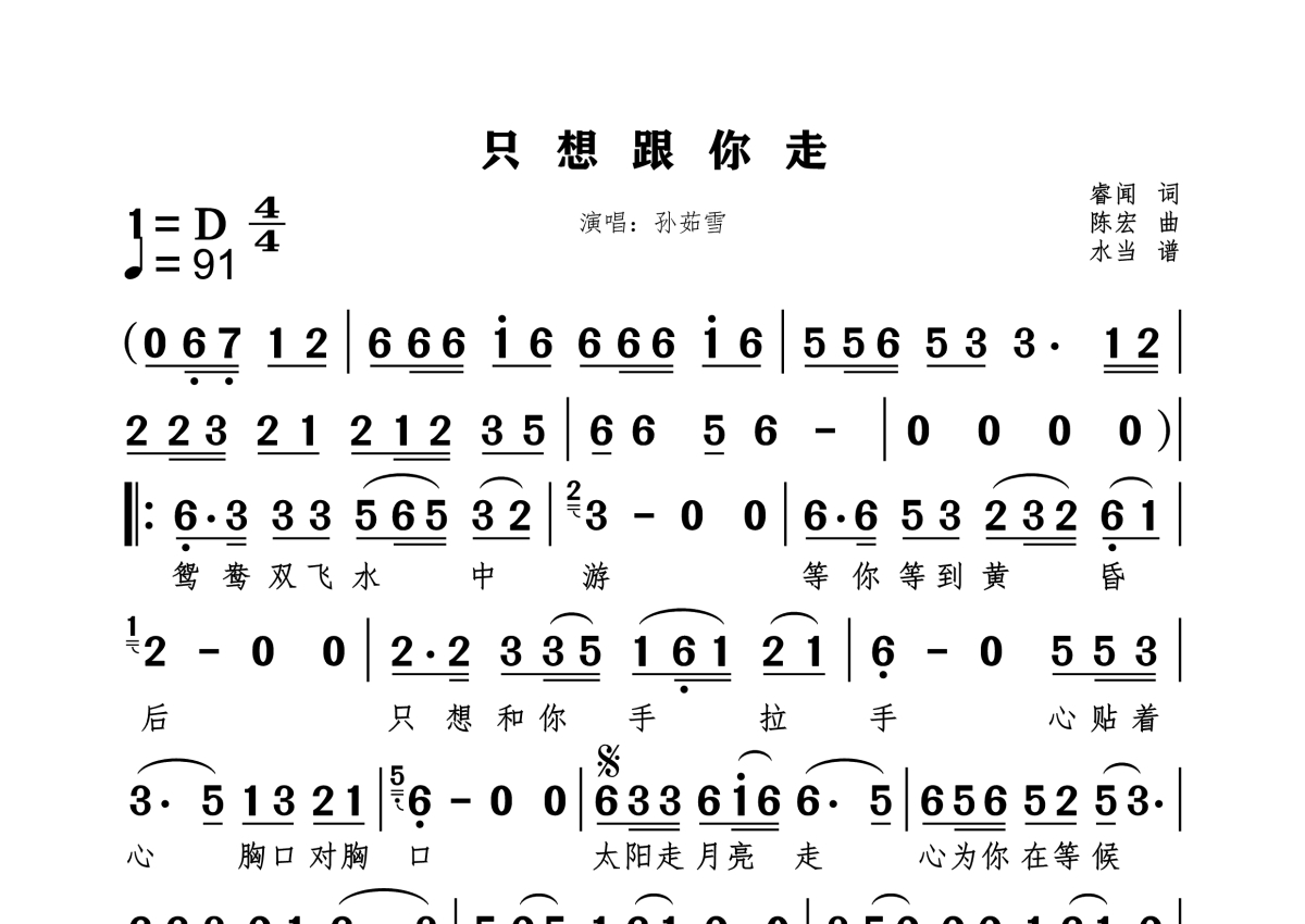 《只想跟你走》是孙茹雪演唱的一首歌曲,拍号为4/4拍,这份简谱共有一张高清图谱,图谱由 @水当 编配上传。