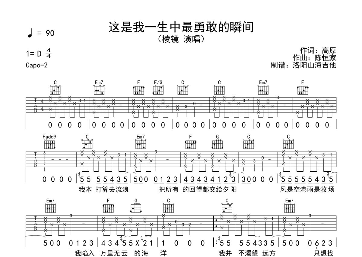 《这是我一生中最勇敢的瞬间》是棱镜演唱的一首歌曲,本吉他谱采用的是C调指法编配,这份吉他谱共有两张高清图谱,图谱由 @何奔洋 编配上传,图谱使用六线谱编配,包含吉他和弦指法、简谱以及歌词部分,曲谱配备了相关的音频提供试听,使用这份这是我一生中最勇敢的瞬间吉他谱,可以让你更加方便地掌握这首歌曲的弹唱技巧,快来尝试吧。