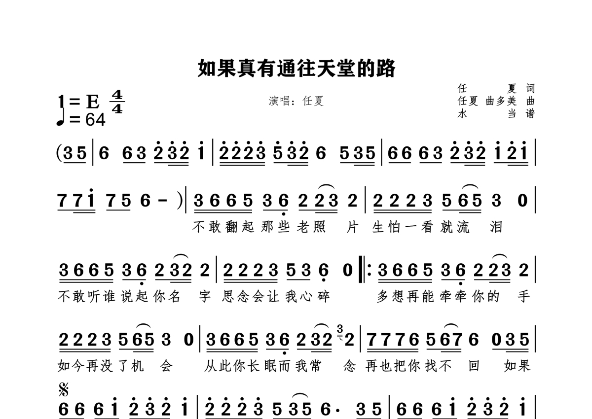 《如果真有通往天堂的路》是任夏演唱的一首歌曲,拍号为4/4拍,这份简谱共有一张高清图谱,图谱由 @水当 编配上传。