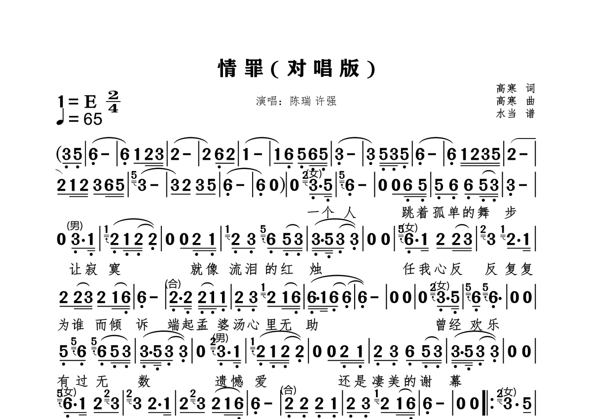 《情罪》是陈瑞&许强演唱的一首歌曲,对唱版,拍号为2/4拍,这份简谱共有一张高清图谱,图谱由 @水当 编配上传。