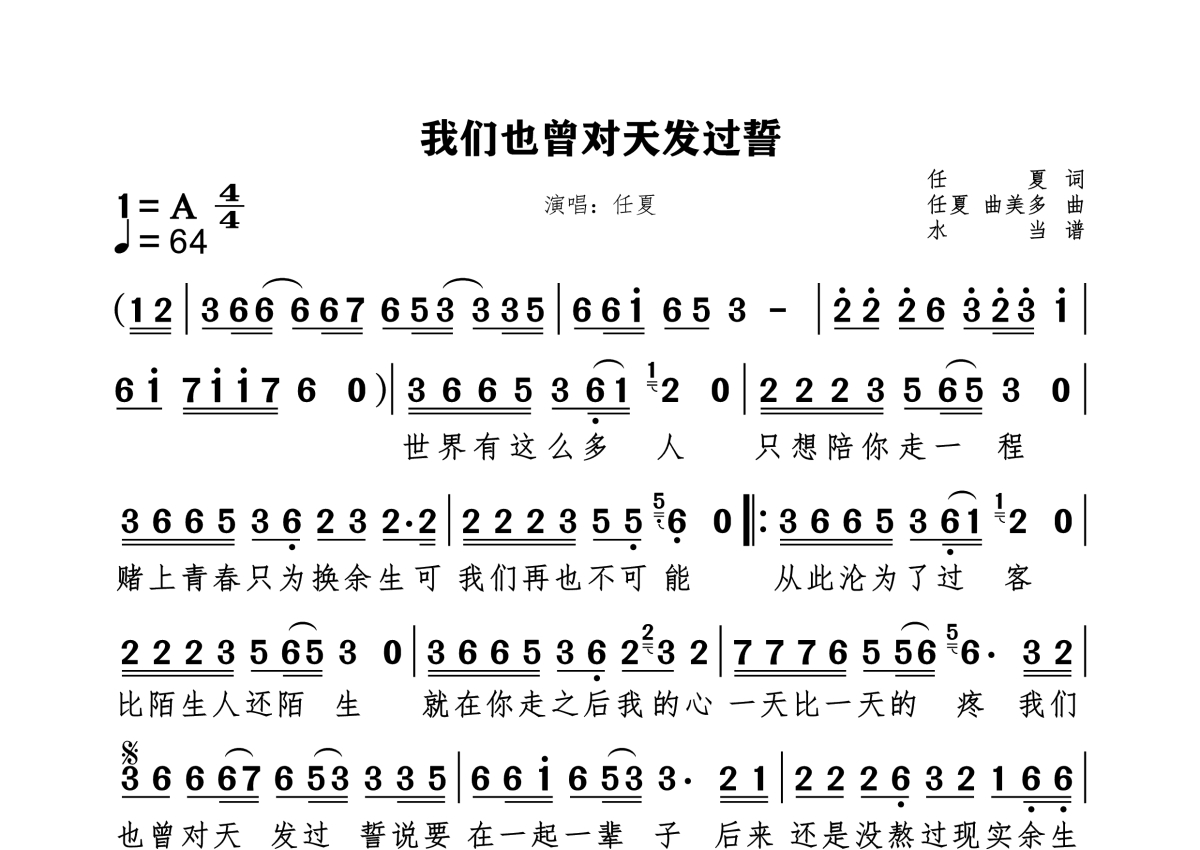 《我们也曾对天发过誓》是任夏演唱的一首歌曲,拍号为4/4拍,这份简谱共有一张高清图谱,图谱由 @水当 编配上传。