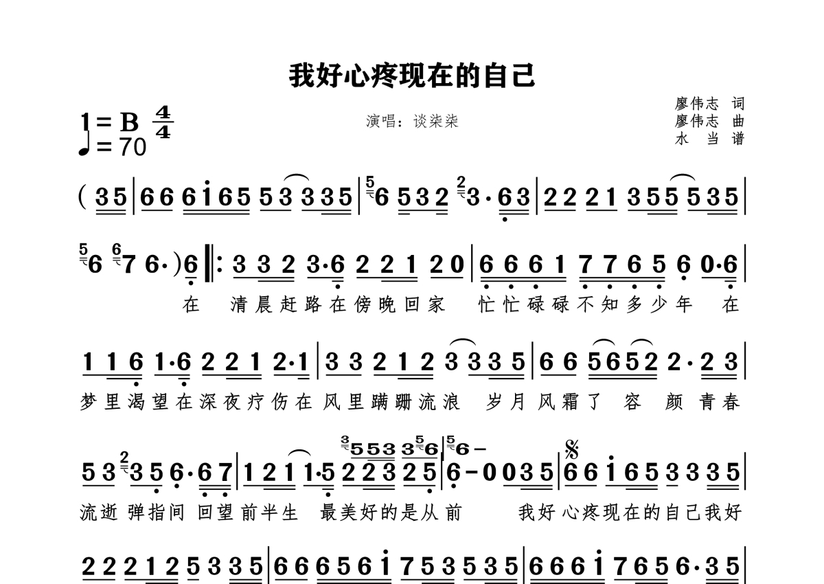 《我好心疼现在的自己》是谈柒柒演唱的一首歌曲,拍号为4/4拍,这份简谱共有一张高清图谱,图谱由 @水当 编配上传。
