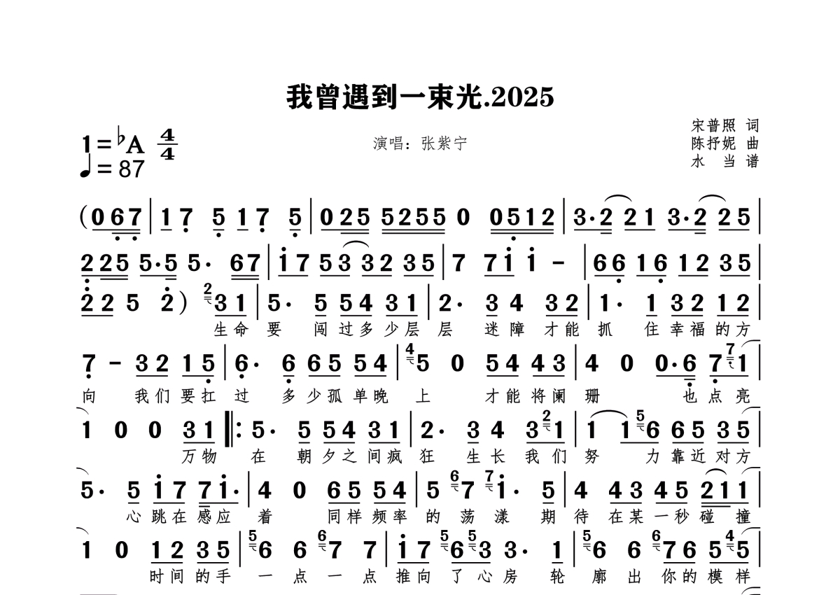 《我曾遇到一束光.2025》是张紫宁演唱的一首歌曲,拍号为4/4拍,这份简谱共有一张高清图谱,图谱由 @水当 编配上传。