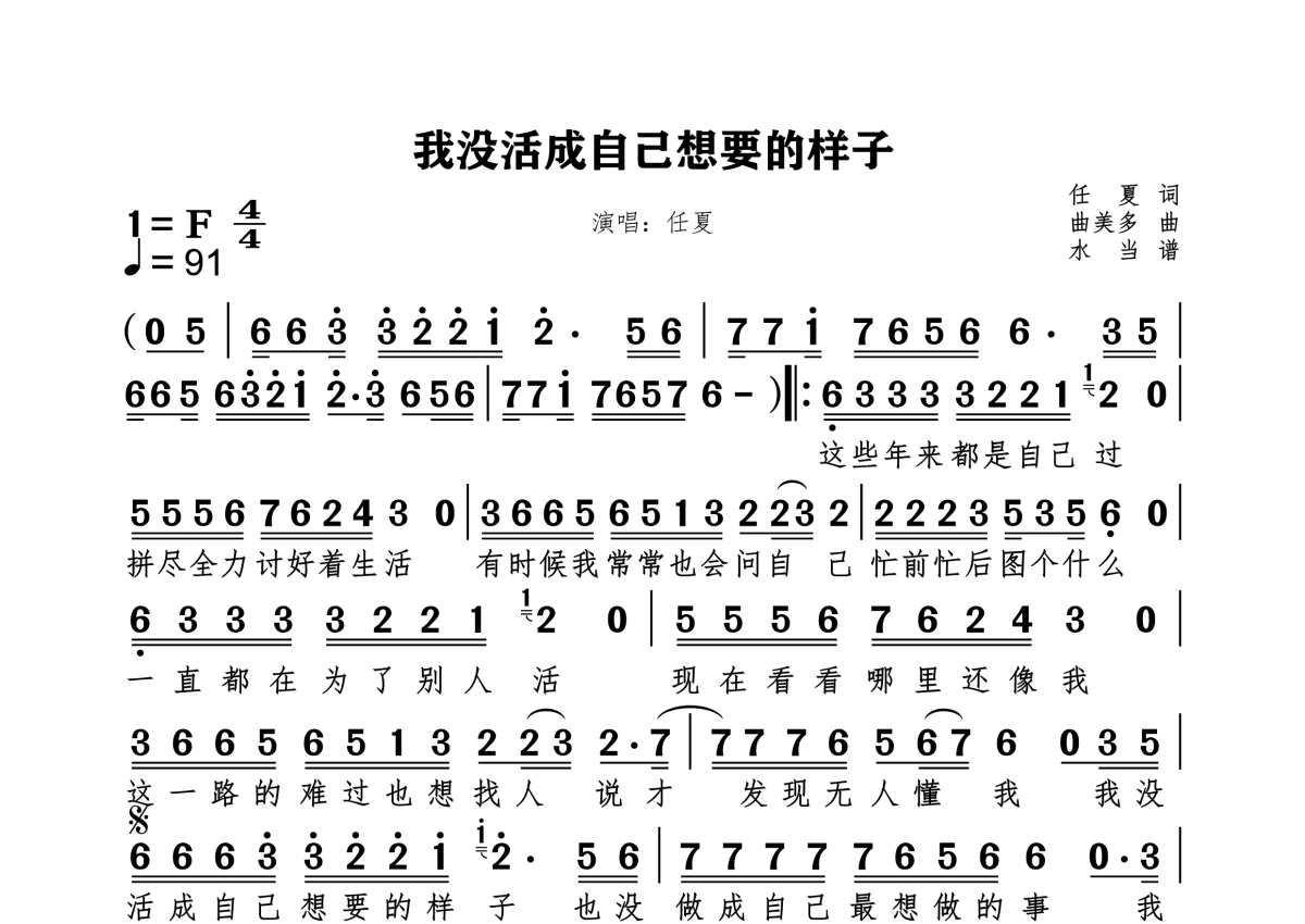 《我没活成自己想要的样子》是任夏演唱的一首歌曲,拍号为4/4拍,这份简谱共有一张高清图谱,图谱由 @水当 编配上传。