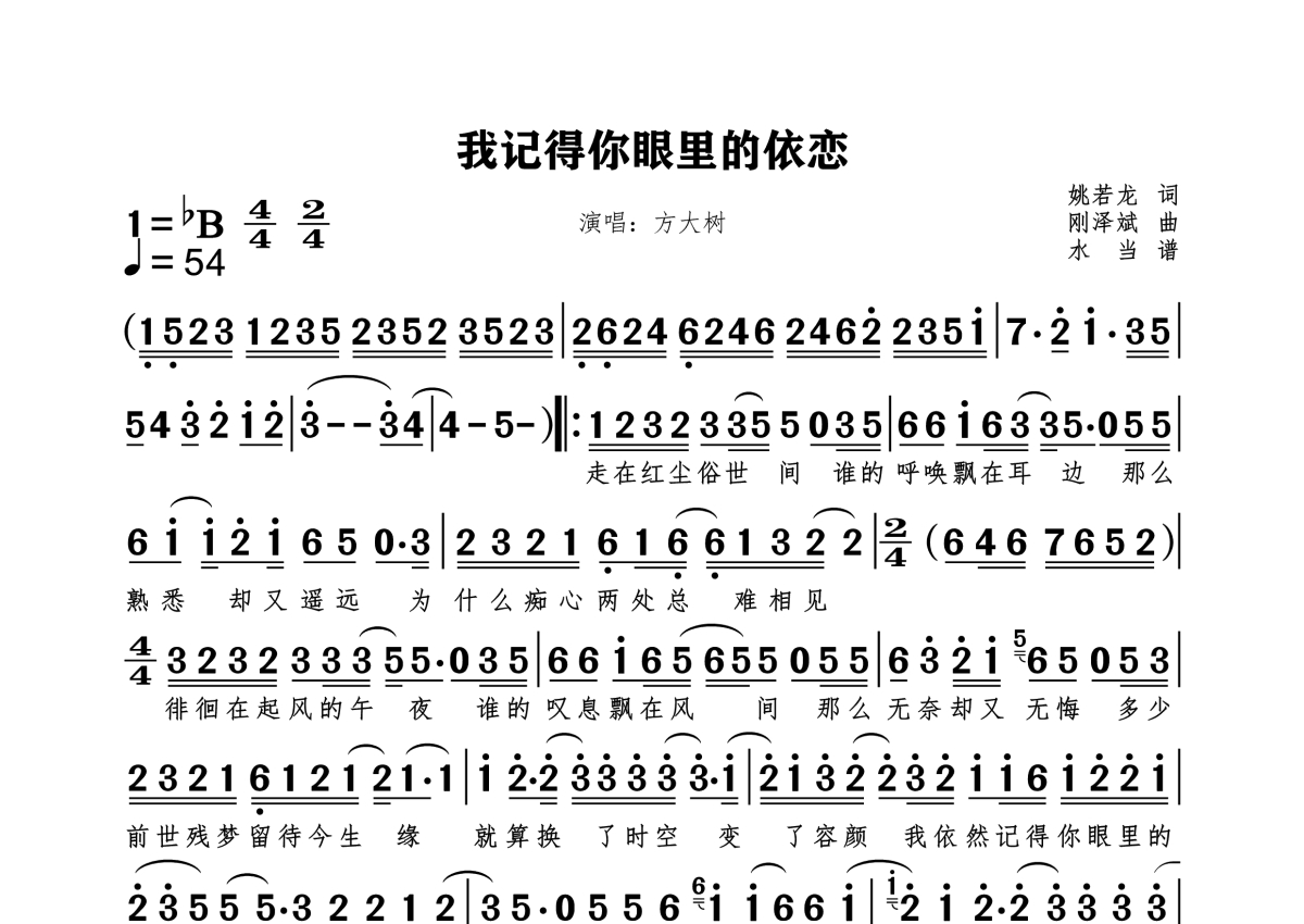 《我记得你眼里的依恋》是方大树演唱的一首歌曲,拍号为4/4拍,这份简谱共有一张高清图谱,图谱由 @水当 编配上传。