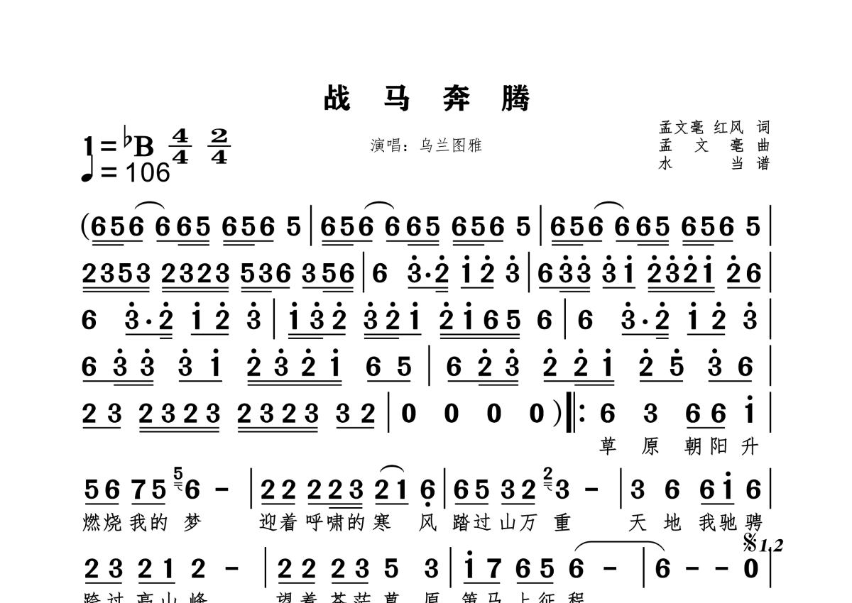《战马奔腾》是乌兰图雅演唱的一首歌曲,拍号为4/4拍,这份简谱共有一张高清图谱,图谱由 @水当 编配上传。