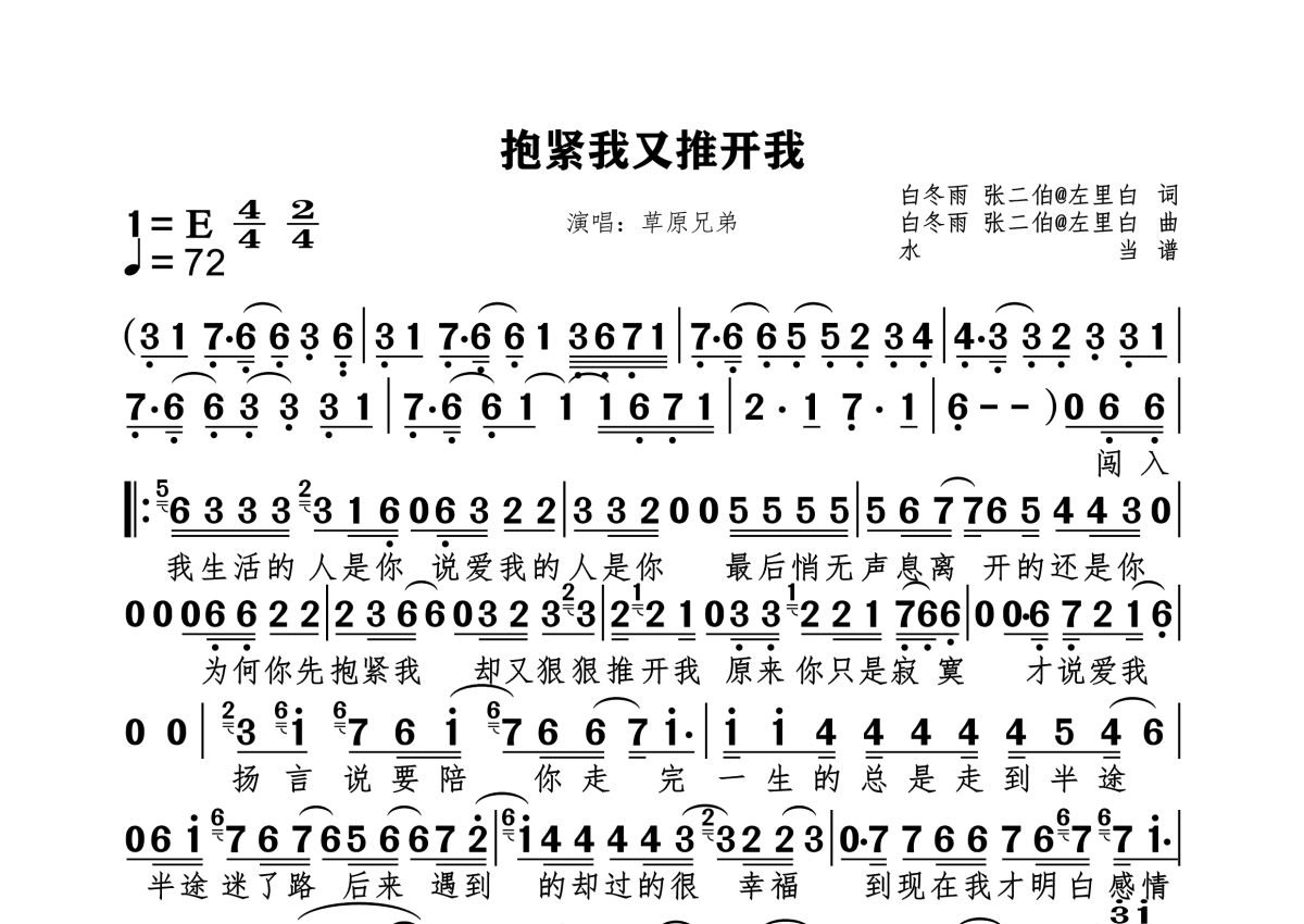 《抱紧我又推开我》是草原兄弟演唱的一首歌曲,拍号为4/4拍,这份简谱共有一张高清图谱,图谱由 @水当 编配上传。