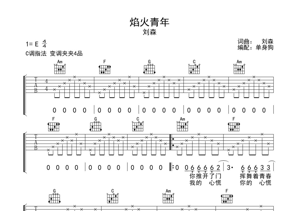 刘森《焰火青年》吉他谱 - C调弹唱六线谱