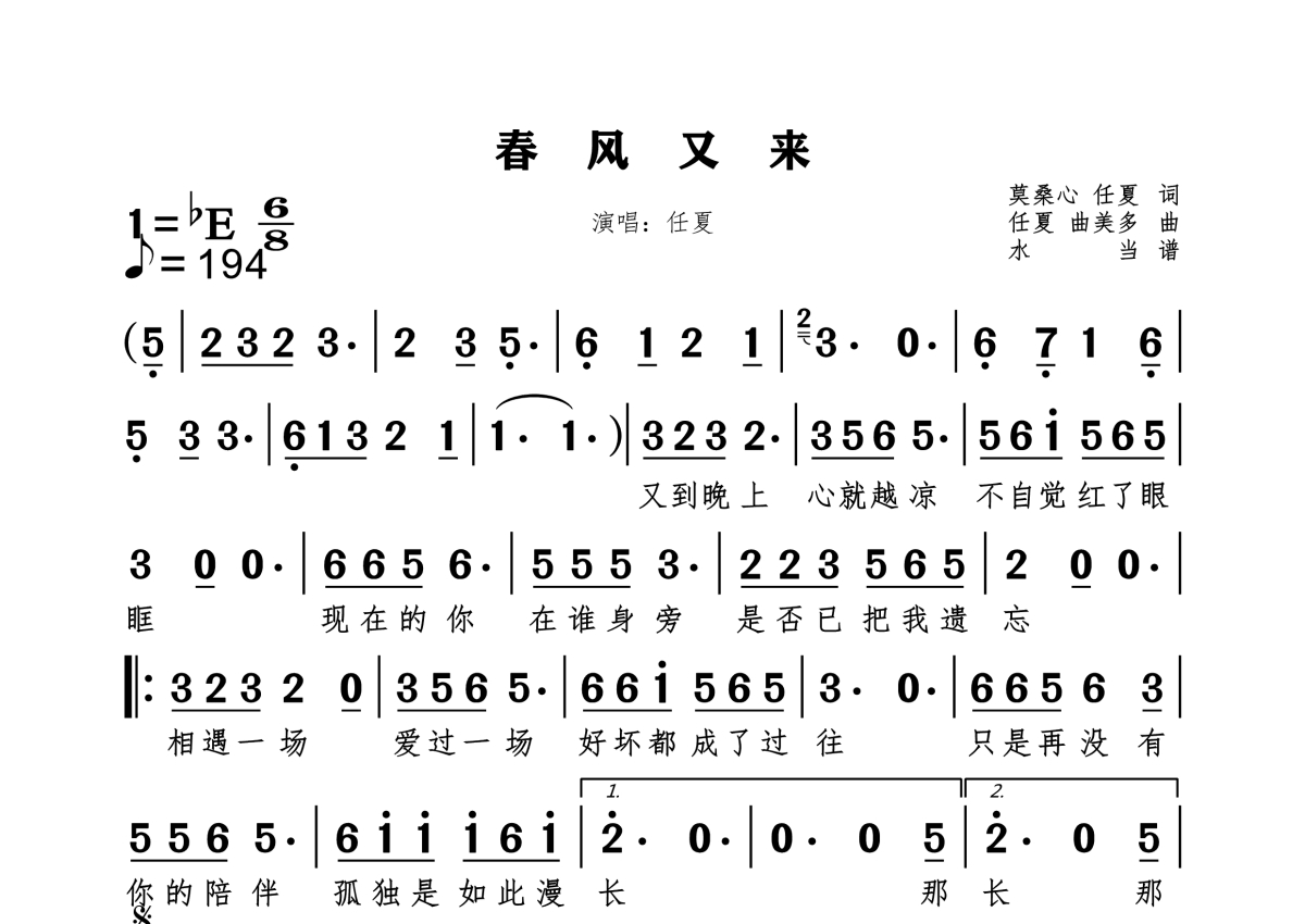 《春风又来》是任夏演唱的一首歌曲,拍号为6/8拍,这份简谱共有一张高清图谱,图谱由 @水当 编配上传。