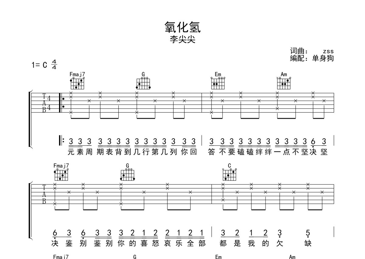 《氧化氢》是李尖尖演唱的一首歌曲,本吉他谱采用的是C调指法编配,这份吉他谱共有两张高清图谱,图谱由 @单身狗 编配上传,图谱使用六线谱编配,包含吉他和弦指法、简谱以及歌词部分,使用这份氧化氢吉他谱,可以让你更加方便地掌握这首歌曲的弹唱技巧,快来尝试吧。李尖尖《氧化氢》吉他弹唱谱,采用C调指法编配,单身狗编配出品,共有2张高清图谱,免翻页排版设计。