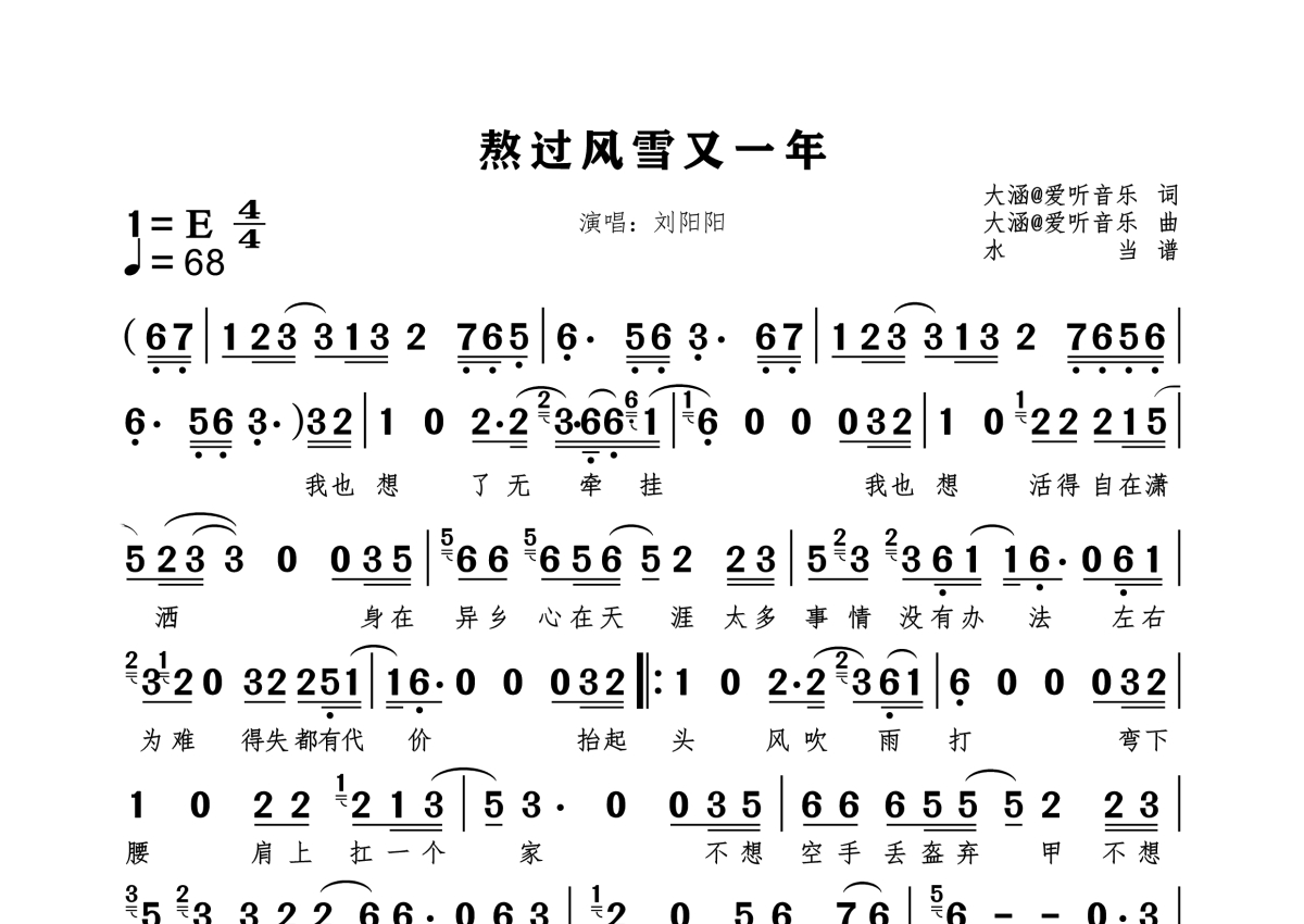 《熬过风雪又一年》是刘阳阳演唱的一首歌曲,拍号为4/4拍,歌曲速度为每分钟68拍,这份简谱共有一张高清图谱,图谱由 @水当 编配上传。