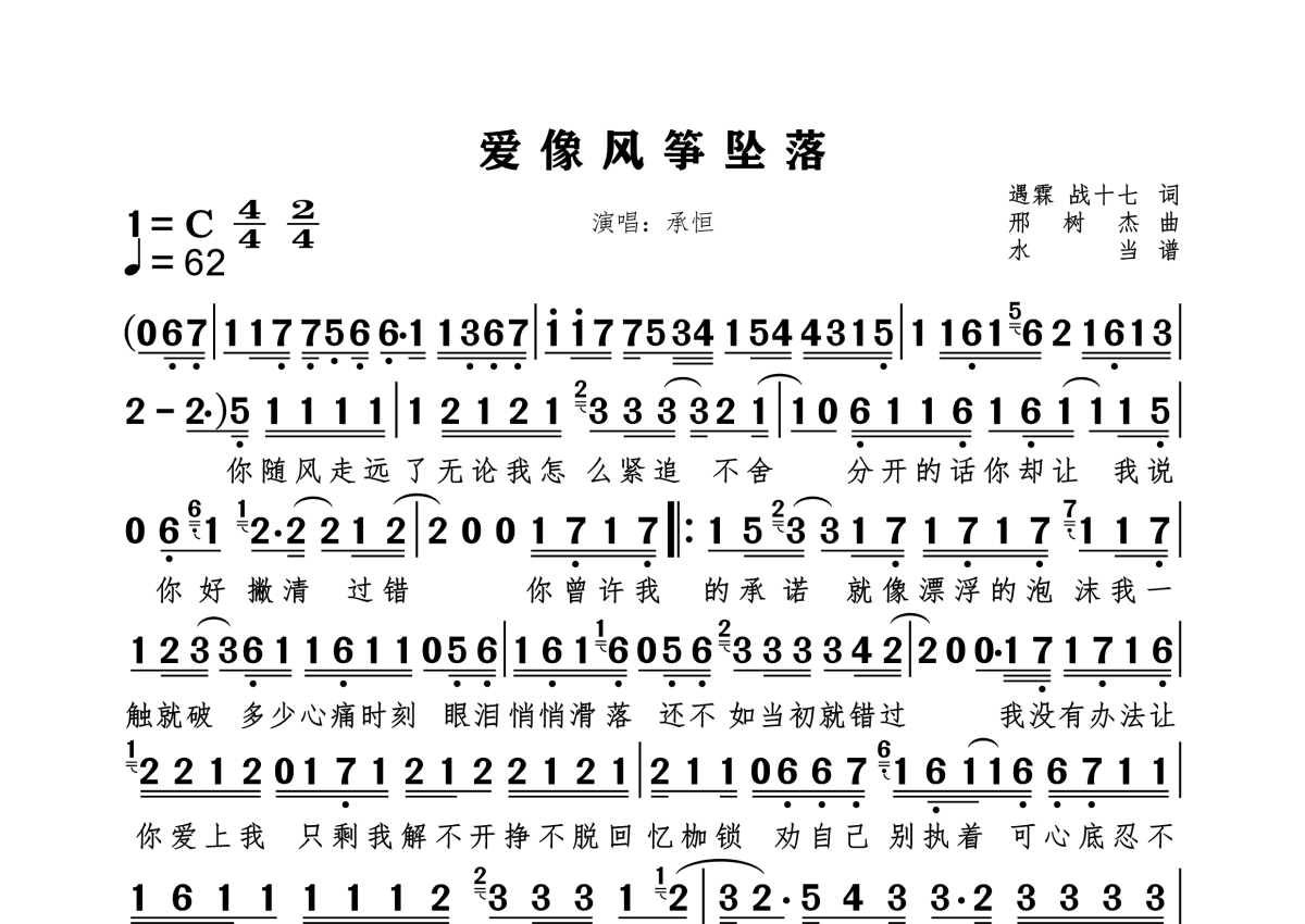 《爱像风筝坠落》是承桓演唱的一首歌曲,拍号为4/4拍,这份简谱共有一张高清图谱,图谱由 @水当 编配上传。
