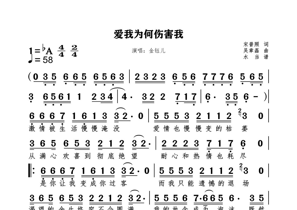 《爱我为何伤害我》是金钰儿演唱的一首歌曲,拍号为4/4拍,这份简谱共有一张高清图谱,图谱由 @水当 编配上传。