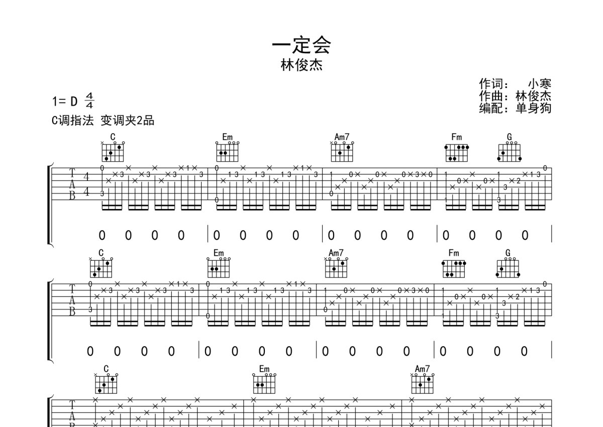 《一定会》是林俊杰演唱的一首歌曲,本吉他谱采用的是C调指法编配,这份吉他谱共有三张高清图谱,图谱由 @单身狗 编配上传,图谱使用六线谱编配,包含吉他和弦指法、简谱以及歌词部分,使用这份一定会吉他谱,可以让你更加方便地掌握这首歌曲的弹唱技巧,快来尝试吧。林俊杰《一定会》吉他弹唱谱,采用C调指法编配,单身狗编配出品,共有3张高清图谱。