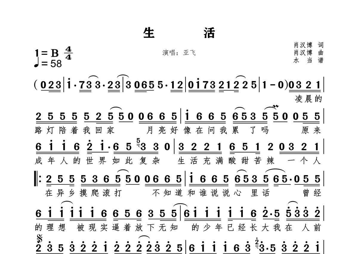 《生活》是亚飞演唱的一首歌曲,拍号为4/4拍,这份简谱共有一张高清图谱,图谱由 @水当 编配上传。