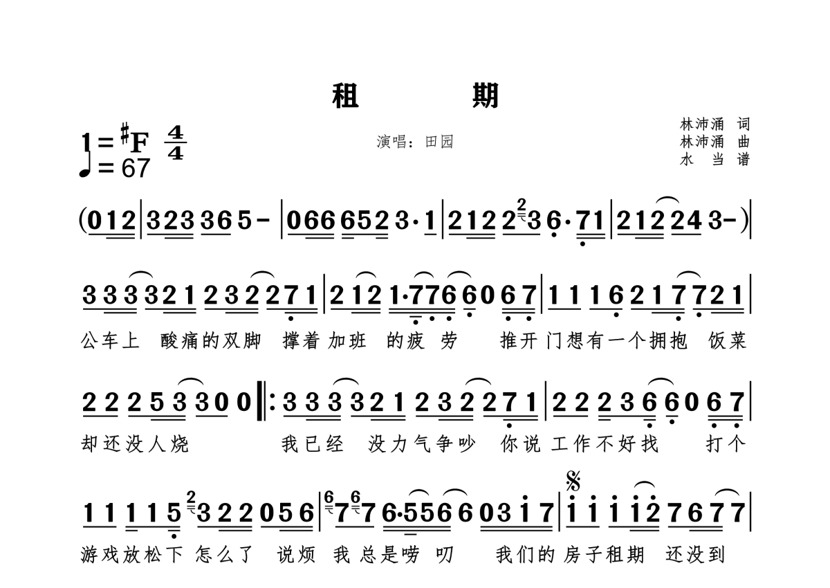 《租期》是田园演唱的一首歌曲,拍号为4/4拍,这份简谱共有一张高清图谱,图谱由 @水当 编配上传。