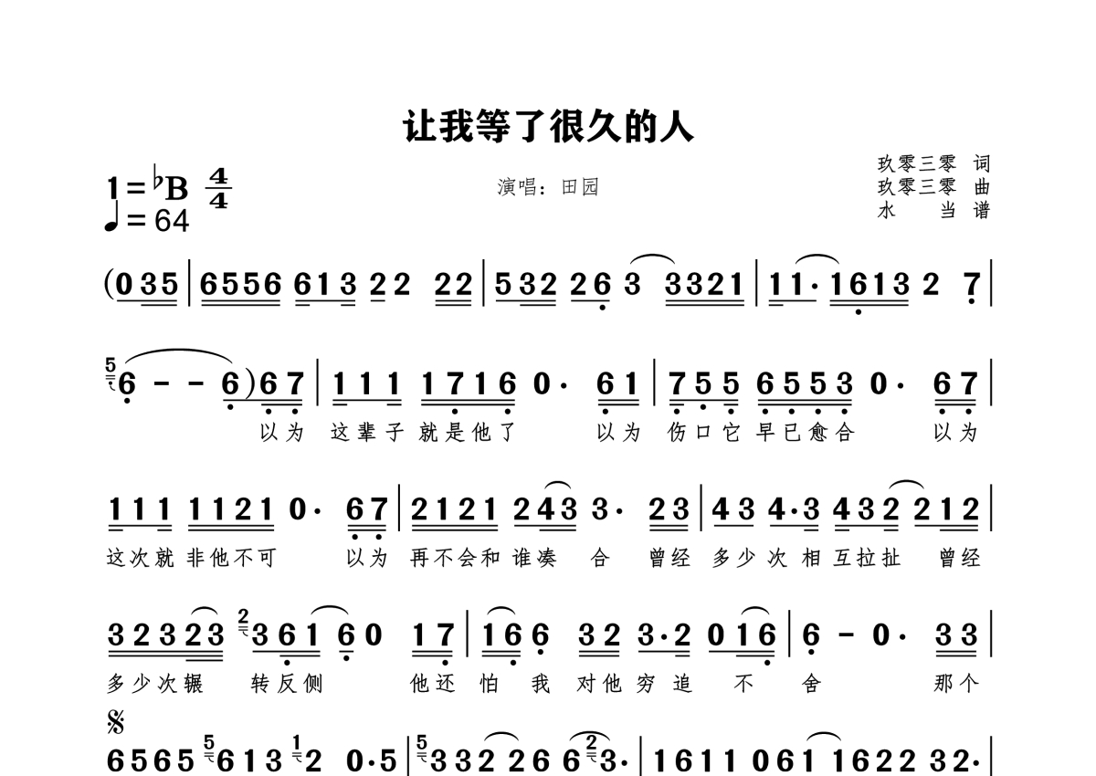 《让我等了很久的人》是田园演唱的一首歌曲,拍号为4/4拍,这份简谱共有一张高清图谱,图谱由 @水当 编配上传。